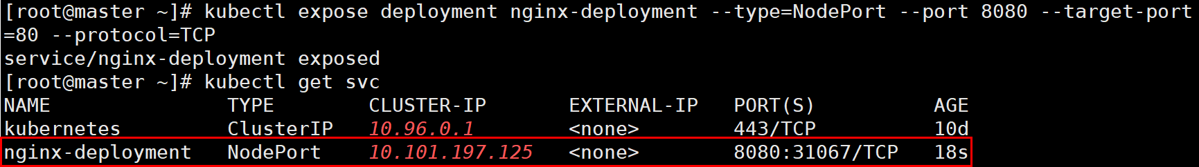 # kubectl expose deployment nginx-deployment --type=NodePort \ --port 8080 --target-port=80 --protocol=TCP # kubectl get svc