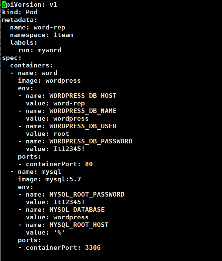 apiVersion: v1 kind: Pod metadata: name: word-rep namespace: 1team labels: run: myword spec: containers: - name: word image: wordpress env: - name: WORDPRESS_DB_HOST value: word-rep:3306 - name: WORDPRESS_DB_NAME value: wordpress - name: WORDPRESS_DB_USER value: root - name: WORDPRESS_DB_PASSWORD value: It12345! ports: - containerPort: 80 - name: mysql image: mysql:5.7 env: - name: MYSQL_ROOT_PASSWORD value: It12345! - name: MYSQL_DATABASE value: wordpress - name: MYSQL_ROOT_HOST value: '%' ports: - containerPort: 33061.2. vi wordsql.yml