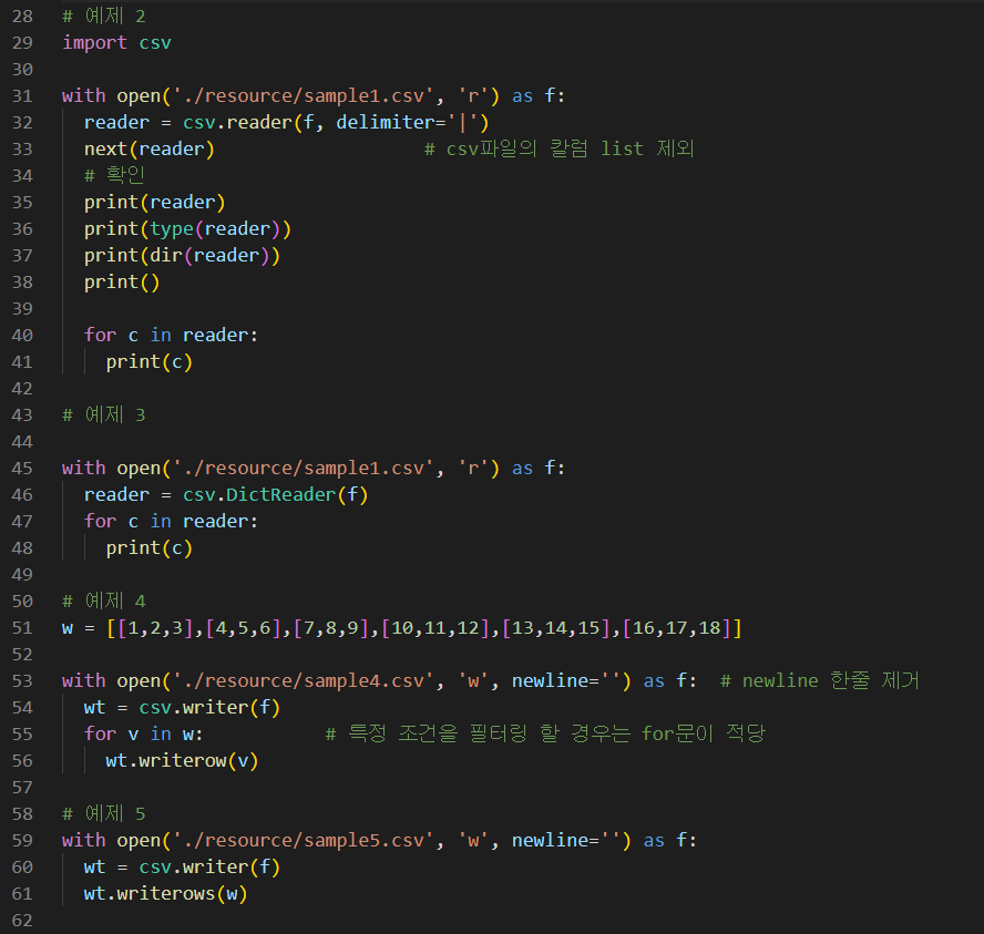 ''' Excel, CSV 처리 1. csv 읽기 2. csv 쓰기 3. xls, xlsx 읽기 4. 패키지 설치 ''' # 파이썬 외부 파일 처리 # 파이썬 Excel, CSV 파일 읽기 및 쓰기 # CSV : MIME - test/csv # 예제 1 import csv with open('./resource/sample1.csv', 'r') as f: reader = csv.reader(f) next(reader) # csv파일의 칼럼 list 제외 # 확인 print(reader) print(type(reader)) print(dir(reader)) print() for c in reader: print(c) # 예제 2 import csv with open('./resource/sample1.csv', 'r') as f: reader = csv.reader(f, delimiter='|') next(reader) # csv파일의 칼럼 list 제외 # 확인 print(reader) print(type(reader)) print(dir(reader)) print() for c in reader: print(c) # 예제 3 with open('./resource/sample1.csv', 'r') as f: reader = csv.DictReader(f) for c in reader: print(c) # 예제 4 w = [[1,2,3],[4,5,6],[7,8,9],[10,11,12],[13,14,15],[16,17,18]] with open('./resource/sample4.csv', 'w', newline='') as f: # newline 한줄 제거 wt = csv.writer(f) for v in w: # 특정 조건을 필터링 할 경우는 for문이 적당 wt.writerow(v) # 예제 5 with open('./resource/sample5.csv', 'w', newline='') as f: wt = csv.writer(f) wt.writerows(w) # XSL, XSLX # openpyxl, xlsswriter, xlrd, xlwt, xlutils # pandas를 주로 사용 # pip install xlrd # pip install openpyxl # pip install pandas import pandas as pd # 옵션 -> sheetname="시트명" 또는 숫자, header=숫자, skiprow=숫자 xlsx = pd.read_excel('./resource/sample.xlsx') print(xlsx.head()) # 문서 앞부분 5줄 print() print(xlsx.tail()) # 문서 끝부분 5줄 print(xlsx.shape) # 행과 열 수 출력 # 엑셀 or csv 다시 쓰기 xlsx.to_excel('./resource/result.xlsx', index=False) xlsx.to_csv('./resource/result.csv', index=False)