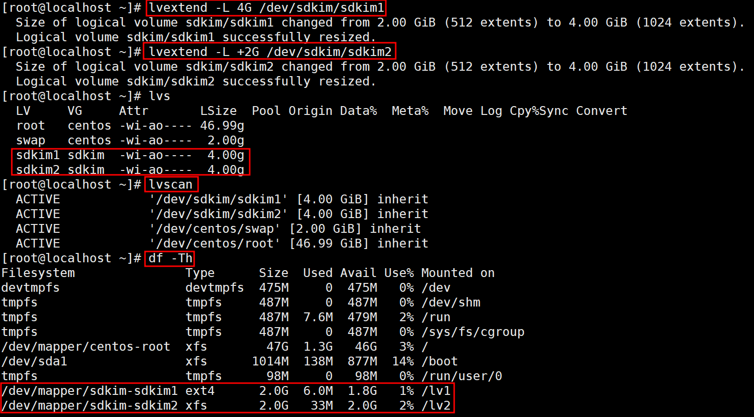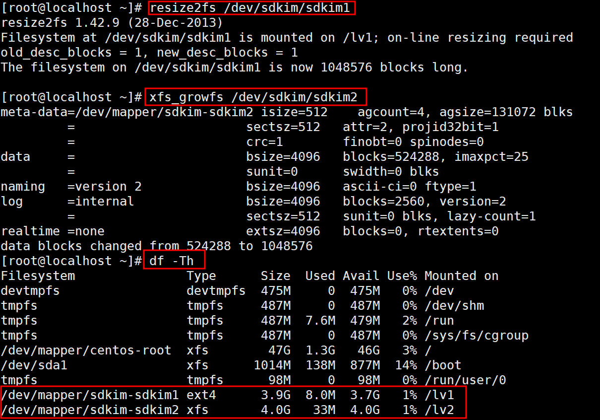 vg 확장 2.6. lv1과 lv2의 용량을 각각 4G로 증설합니다.