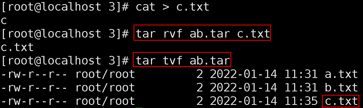2.6. c.txt 다시 생성. 파일 내용은 파일 이름과 동일하게 생성(확장자 제외). 기존 ab.tar 파일에 c.txt 파일 추가