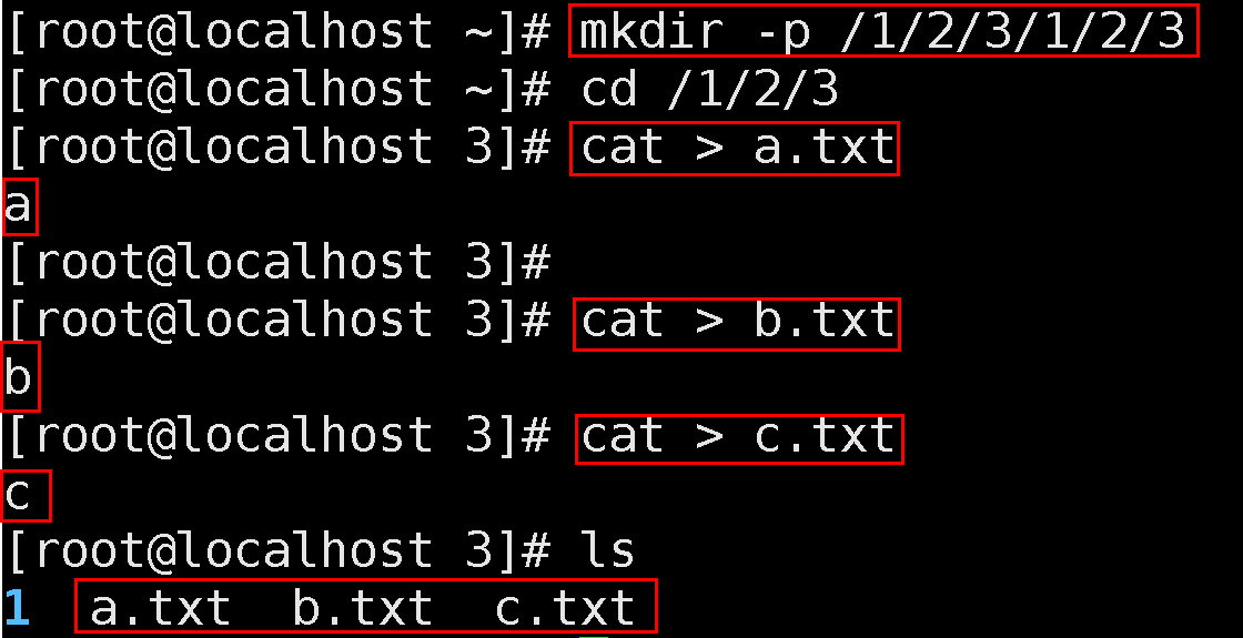 2.2. 첫번째 3 디렉토리 이동 후 a.txt, b.txt, c.txt 파일 생성(파일내용은 파일이름과 동일하게. 확장자 제외)