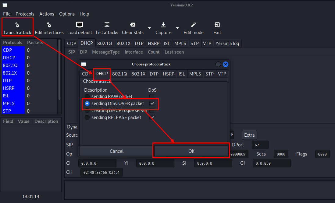 Launch attack ->DHCP -> Sending DISCOVER 선택 -> OK