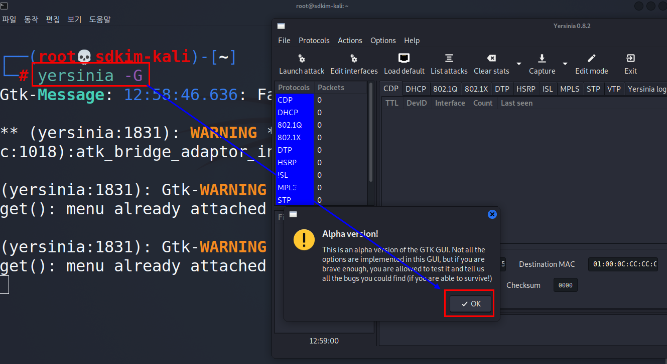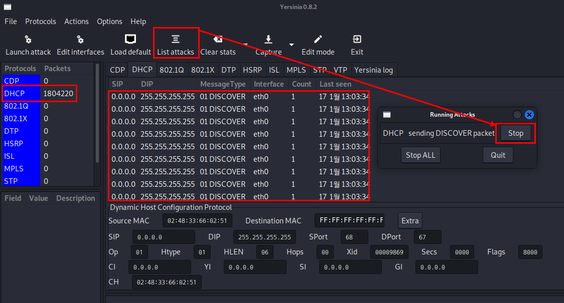 yersinia 실행 2.4. Protocols 메뉴에서 DHCP만 선택