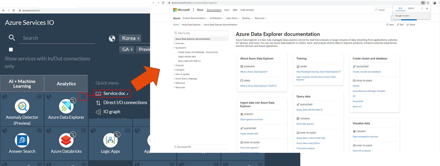 3.2.2. 개별 서비스 우측 상단 그래프 클릭 -> Service Doc 클릭 -> Azure 기술문서 자료사이트 이동