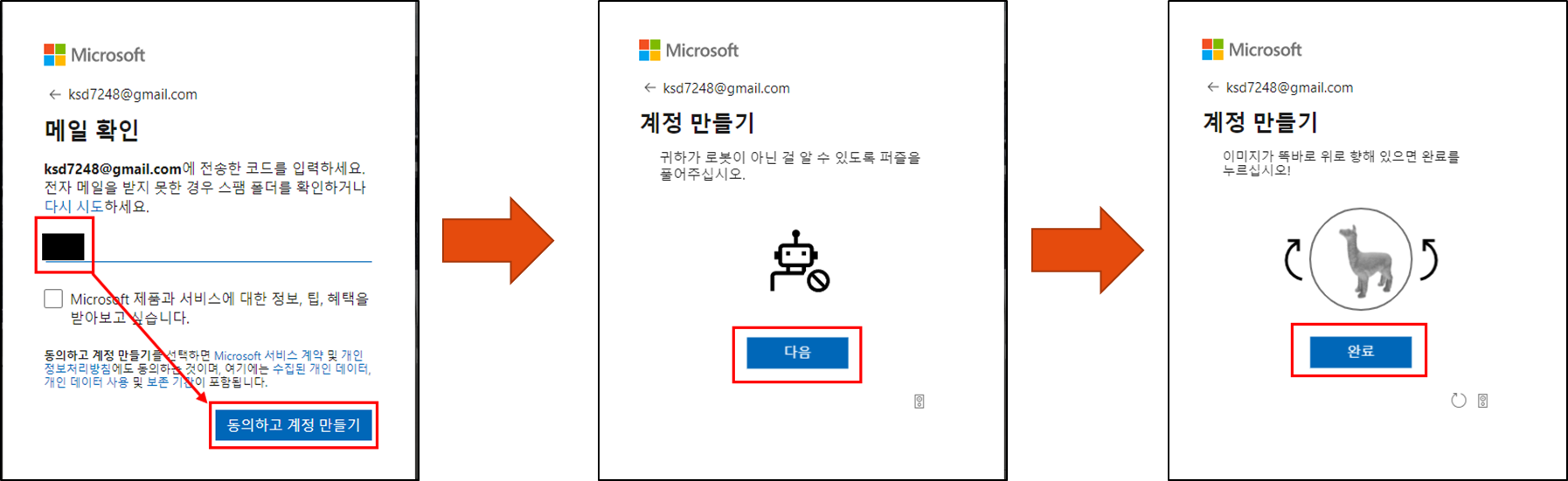 3.1. "계정을 만드세요" 클릭 -> 메일 주소 입력 -> 암호 -> 국가 및 생년월일 입력