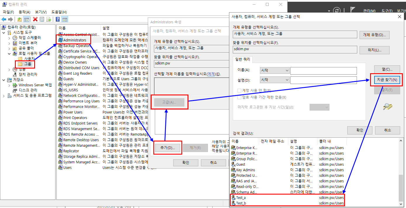 3.2.2. 컴퓨터관리 -> 그룹 -> Administrators -> 추가 -> 찾을 위치 : 도메인 -> 고급 클릭