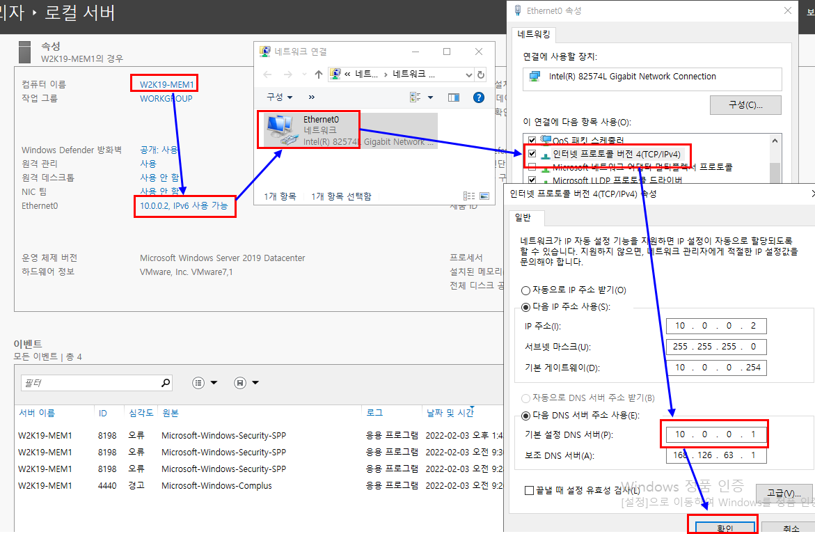 1.1.2. 두번째 서버의 1차 DNS를 DC의 IP로 수정합니다.