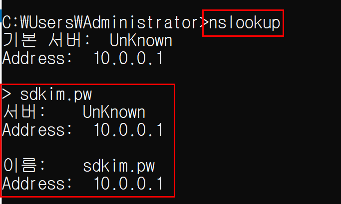 1.2.2. 도메인 이름 입력 후 IP 정상 출력 여부 확인