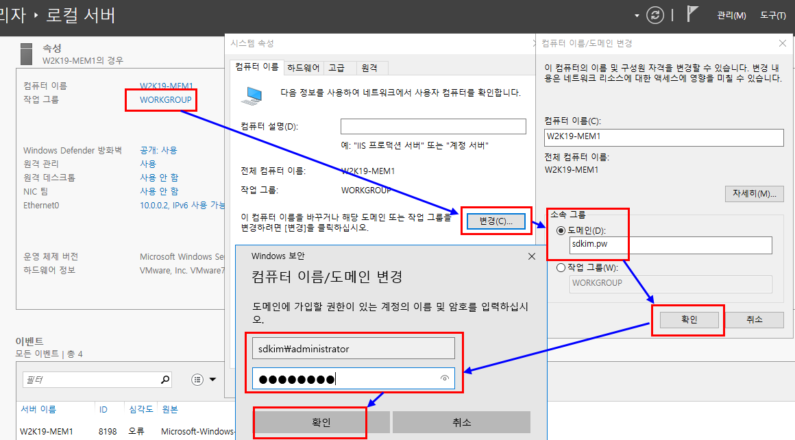 4.5.2. 로컬서버 -> 도메인 -> 변경 -> 도메인 -> Netbios 입력 -> 확인 -> 자격증명 입력