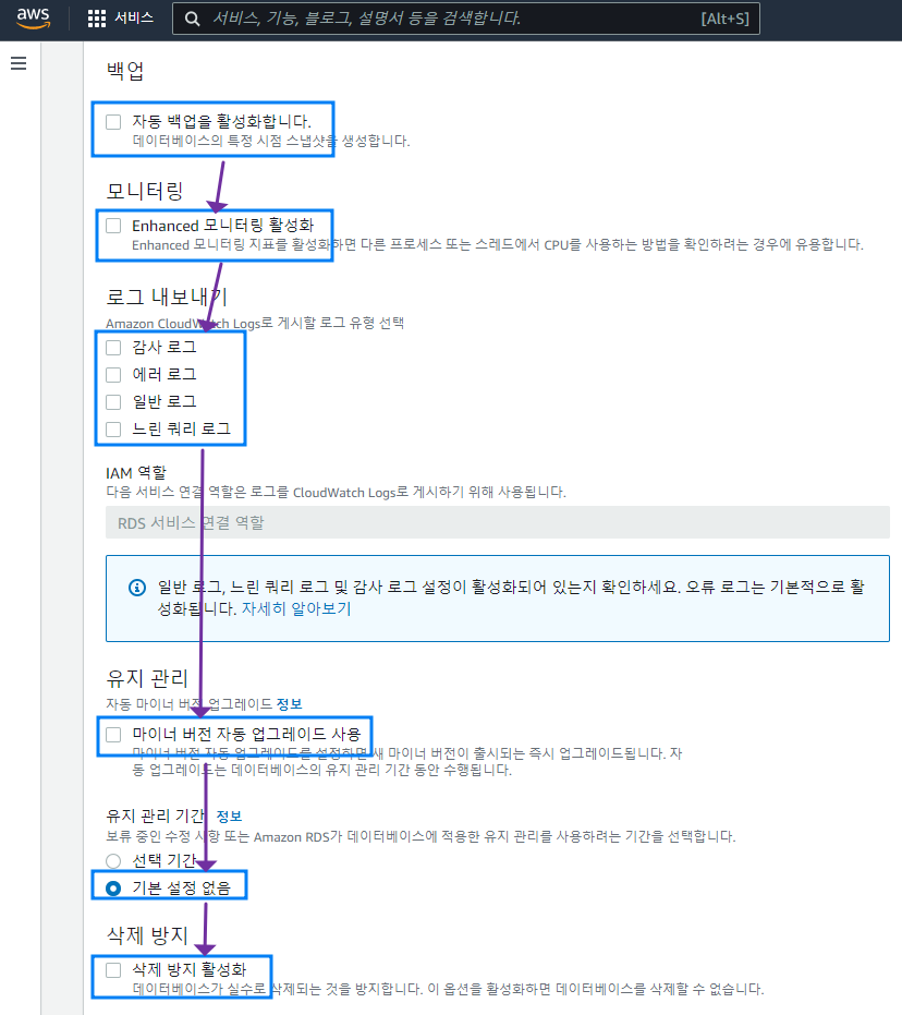 DB 생성 - 5 1.3.24. 자동 백업 활성화 : 사용 안 함