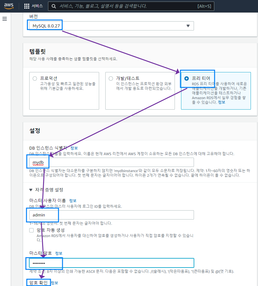 1.3.6. DB 인스턴스 식별자 : mydb - Endpoint의 제일 앞 머리글자로 사용됨.