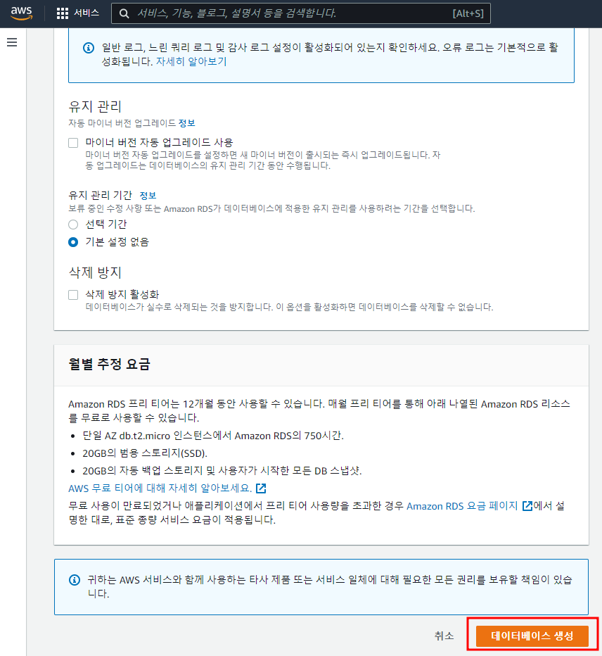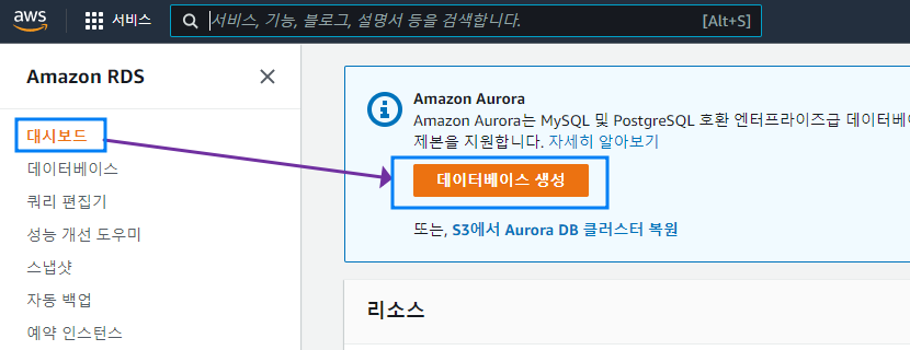 1.2.1. RDS Dashboard -> "데이터베이스 생성" 클릭