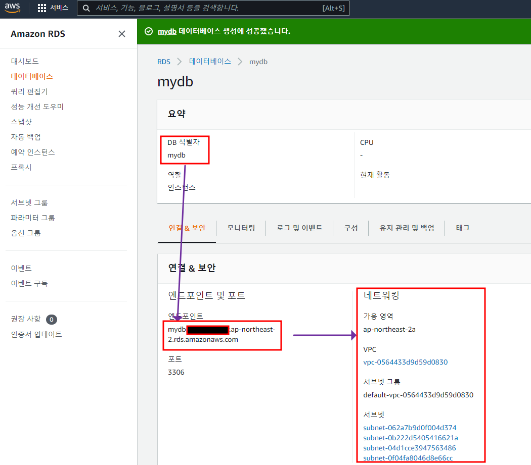 역기서 DB를 생성해본 의도는 DB의 Endpoint 확인용 입니다.