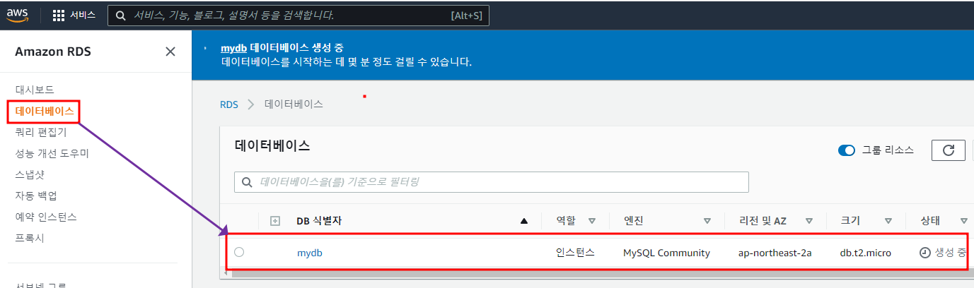 2.1. Dashboard -> 데이터베이스 -> 생성 중 DB 확인 후 클릭
