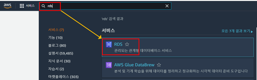 1.1. AWS Web Console 상단 검색창에서 rds 검색 후 조회되는 RDS 선택