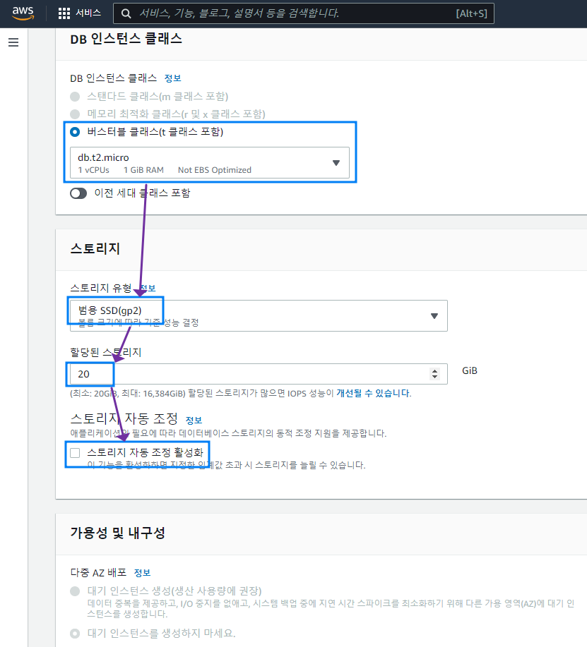 DB 생성 - 2 1.3.10. 인스턴스 클래스 : db.t2.micro