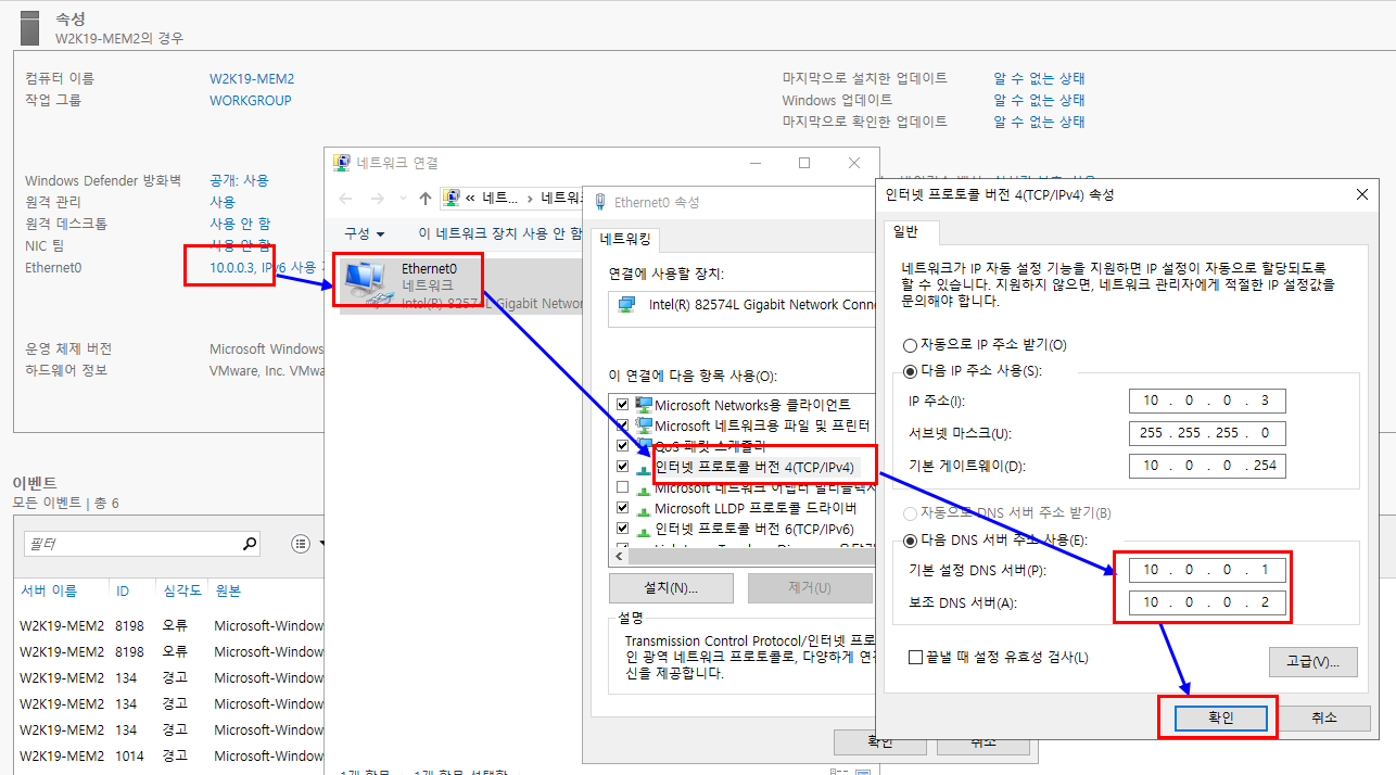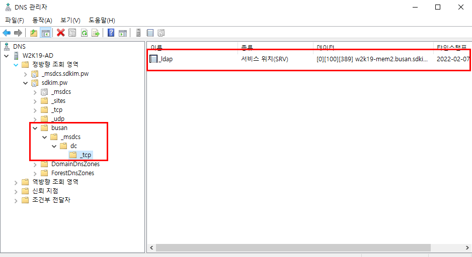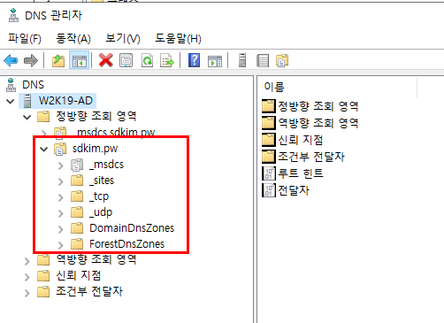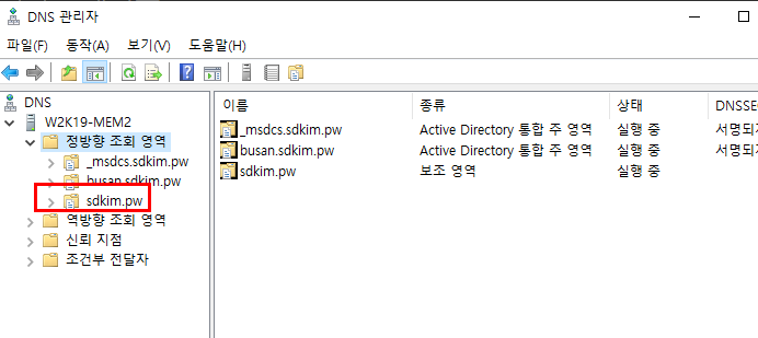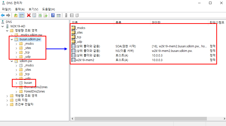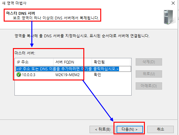 또한 이렇게 서로 다른 도메인으로 구성한 경우에는 상대방의 DNS 정보를 나의 DNS 보조 영역으로 구성하는 것이 원활한 통신을 보장하기 보조영역까지 구성하도록 합니다.
