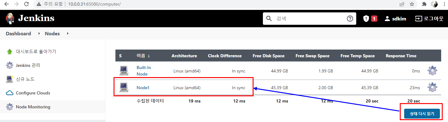 3.1.1. Master Node에서 '신규노드'를 클릭하면 추가된 Node 확인 가능