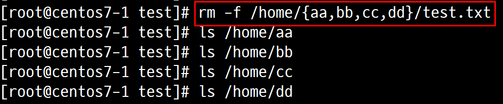 2.3.1. # rm -f /home/{aa,bb,cc,dd}/test.txt