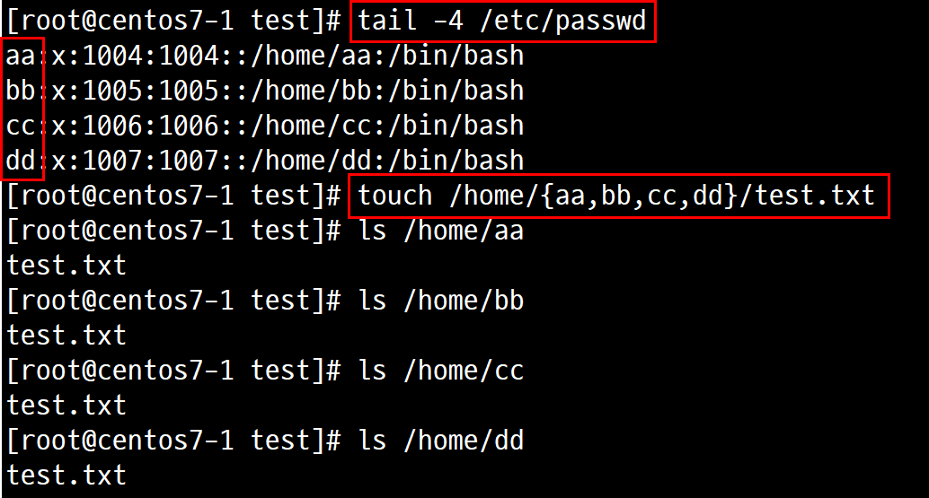 2.2.1. # touch /home/{aa,bb,cc,dd}/test.txt