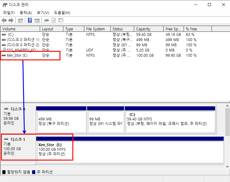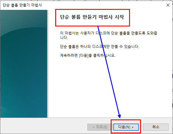 2.1.1. 온라인 상태의 디스크 -> 마우스 우측 버튼 -> "새 단순 볼륨" 선택