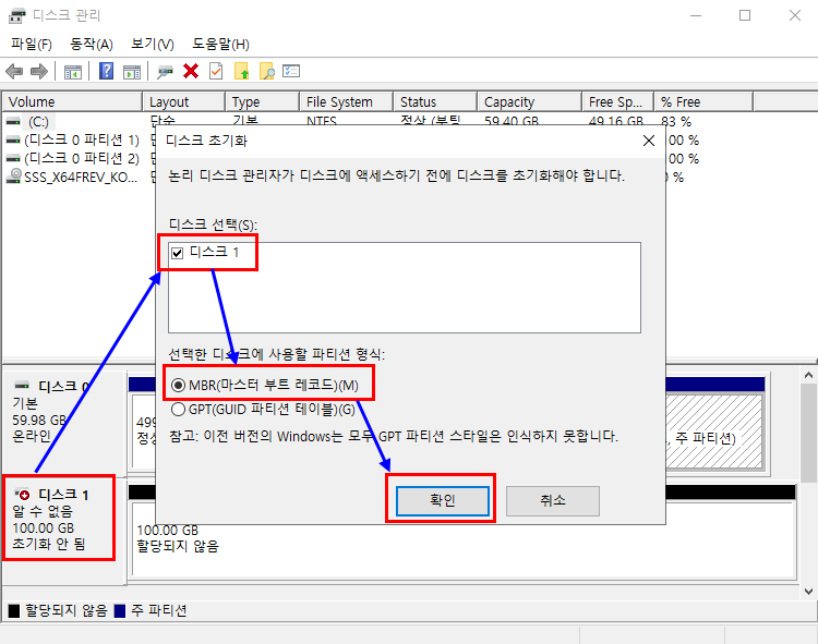 1.3.1. 디스크 관리 콘솔 -> 디스크 1 선택 -> MBR 체크 -> 확인