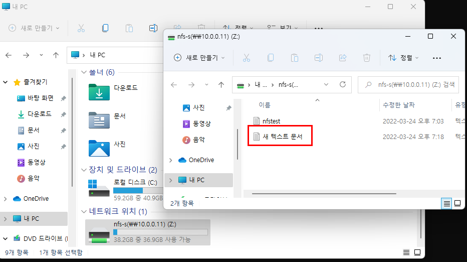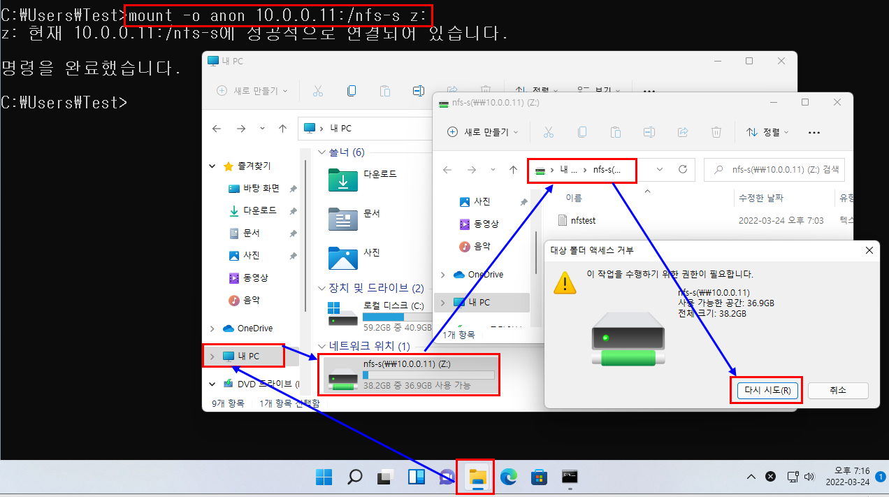 3.3.1. 탐색기 -> 내 PC -> 네트워크 위치 z: 확인 -> 파일 생성 시도 -> 거부됨