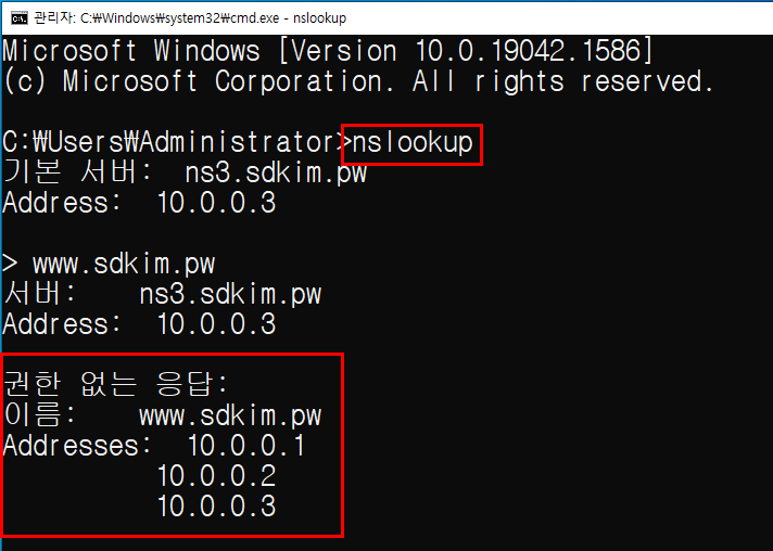 DNS 조회 시 "권한 없는 응답"이란 메세지를 보실 수 있습니다.