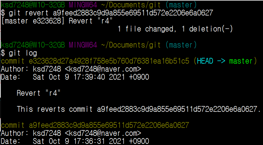 파일 확인 2. git revert : 선택한 버전으로 돌아감.
