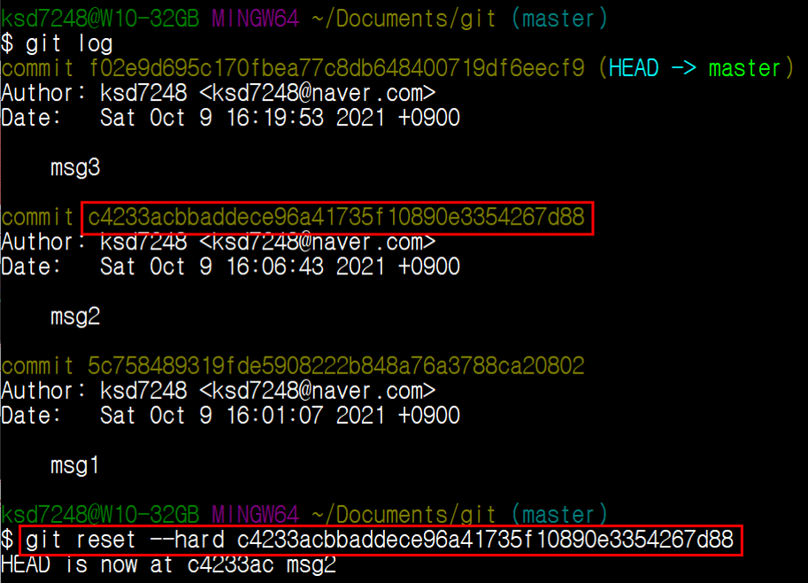 1.2.1. git reset --hard COMMIT ID 2번