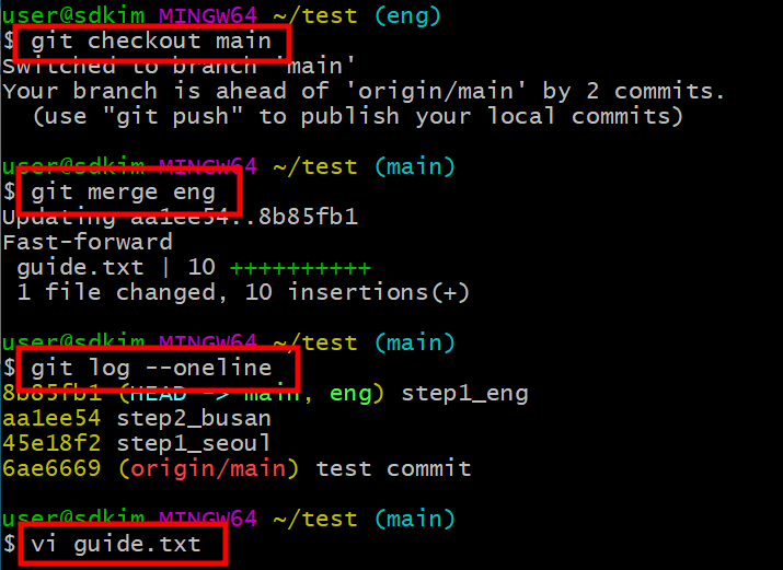 각기 다른 branch에서 작업한 파일을 통합하는 과정입니다.