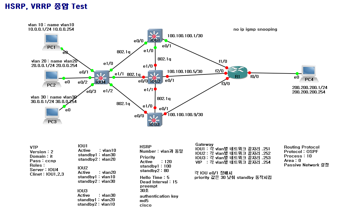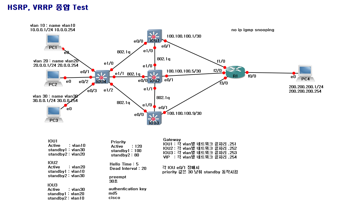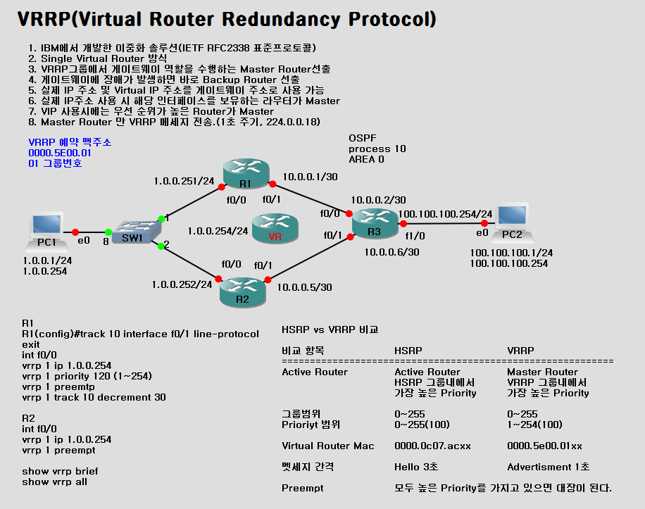 2. VRRP Group내에서 가장 높은 Priority 값Group 범위 0~255 0~255 Priority 범위 0~255 (기본값 100) 1~254 (기본값 100) Virtual Rotuer Mac Address 0000.0C07.ACxx 0000.5E00.01xx 멧세지 간격 Hello 3초 Message 1초 Preempt 높은 Priority 값을 갖으면 대장 높은 Priority 값을 갖으면 대장 4. 실습