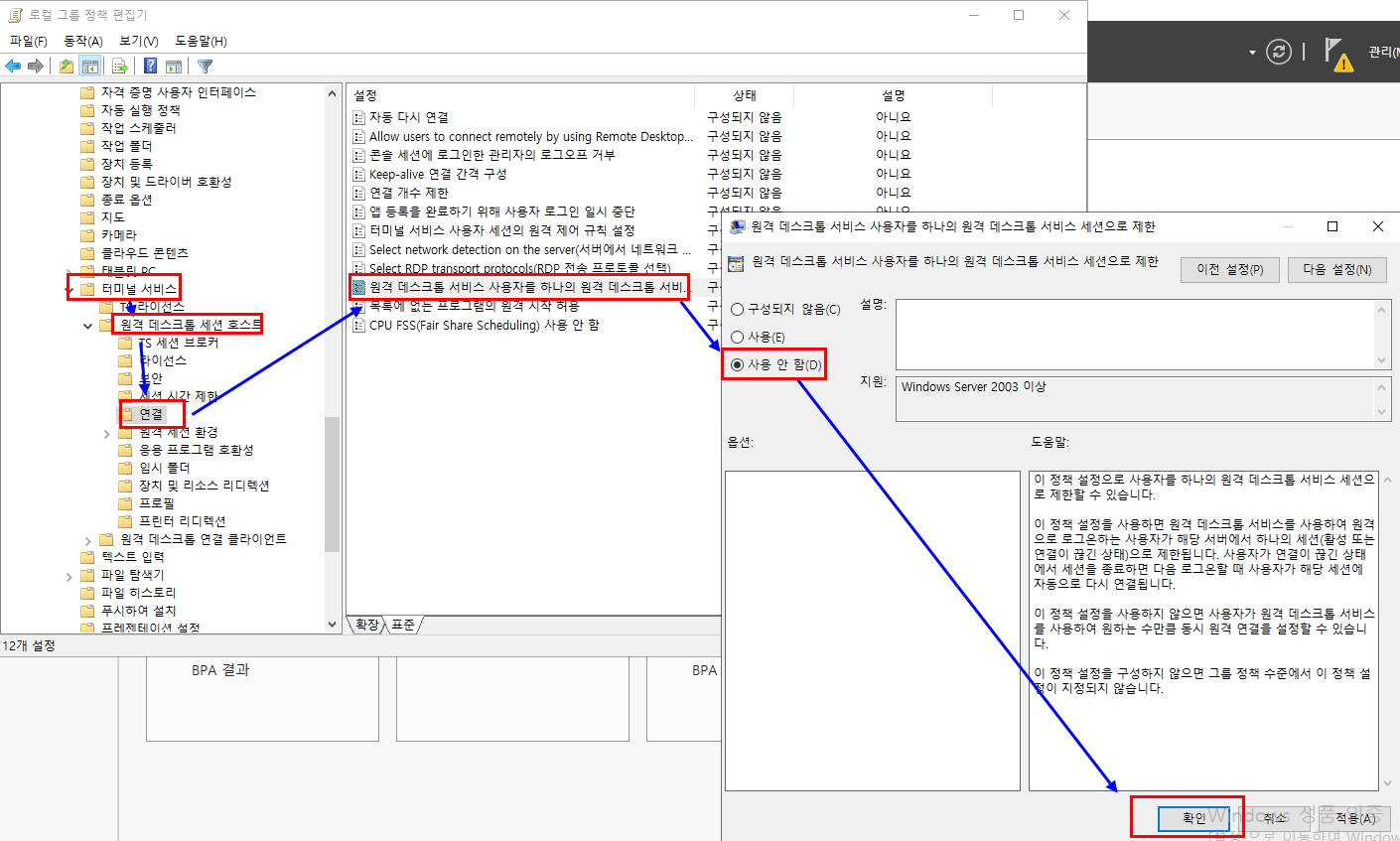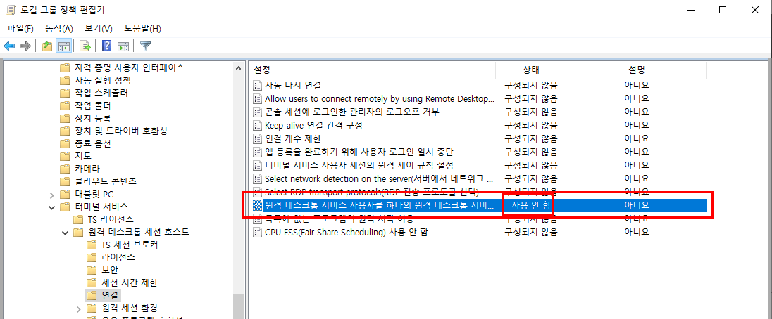 그룹정책에서 세션 제한을 "사용 안 함"으로 설정하면 문제가 해결됩니다.