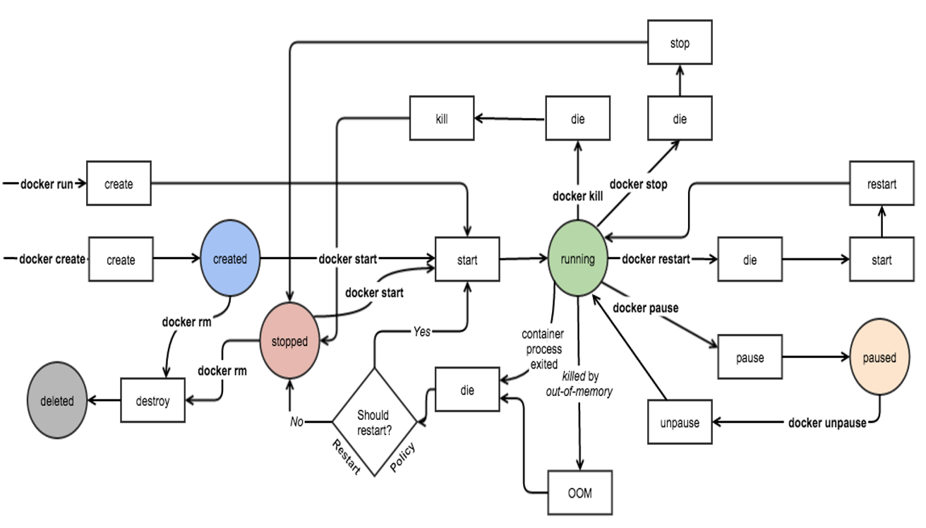 1.2.1. docker create -> docker start -> running -> docker stop -> stopped -> docker rm -> deleted