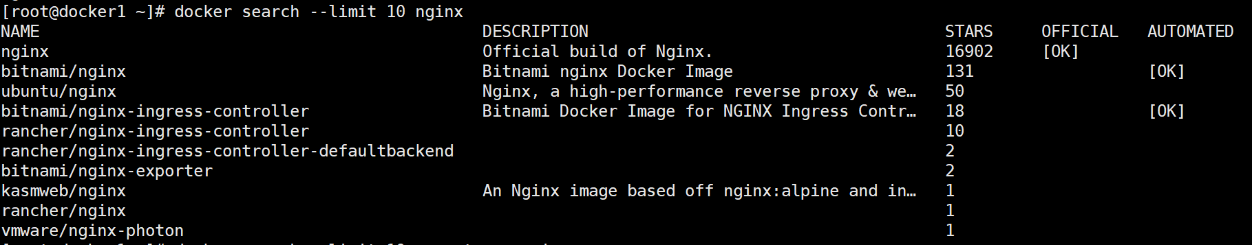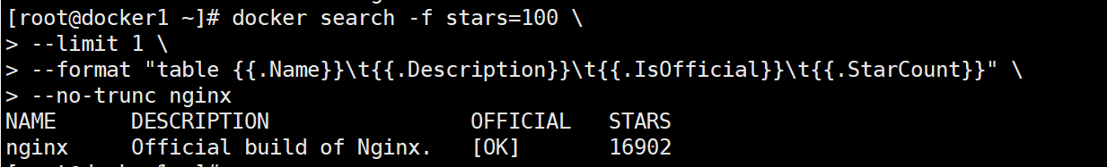 docker search --format "table {{.Name}}\t{{.StarCount}}\t{{.IsOfficial}}" nginx