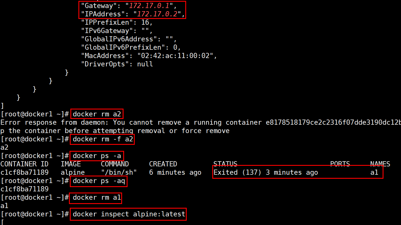 docker run -itd --name a2 alpine docker ps docker inspect a2 docker rm -f a2 docker ps -a