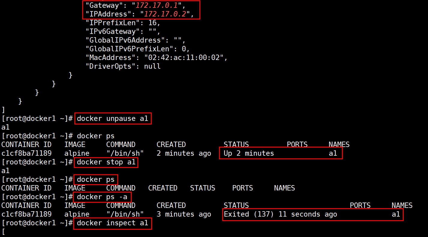 docker start a1 docker pause a1 docker ps docker inspect a1 docker unpause a1 docker ps docker stop docker ps docker ps -a docker inspect a1