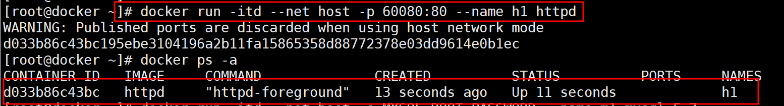 # docker run -itd --net host --name h1 httpd # docker run -itd --net host -e MYSQL_ROOT_PASSWORD=It12345z! --name m1 mysql