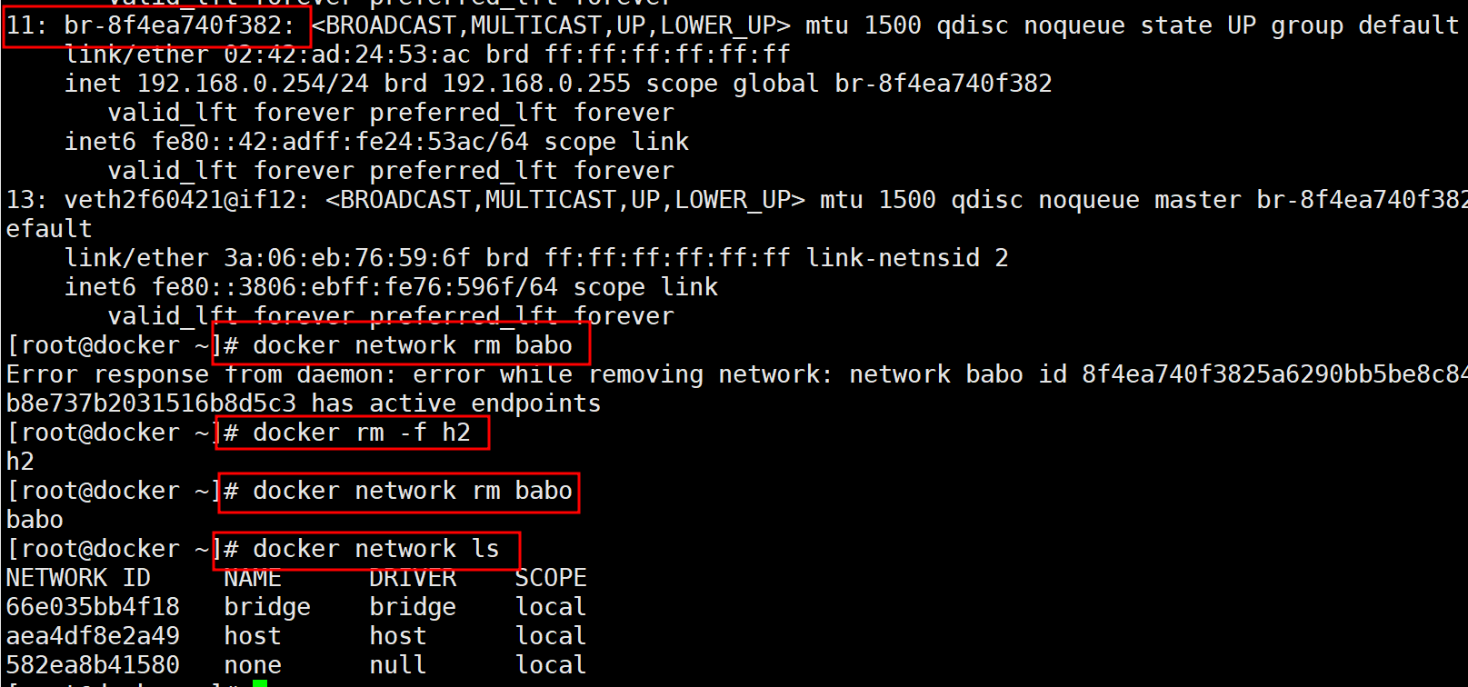 # docker rm -f h2 # docker network rm babo # docker network ls