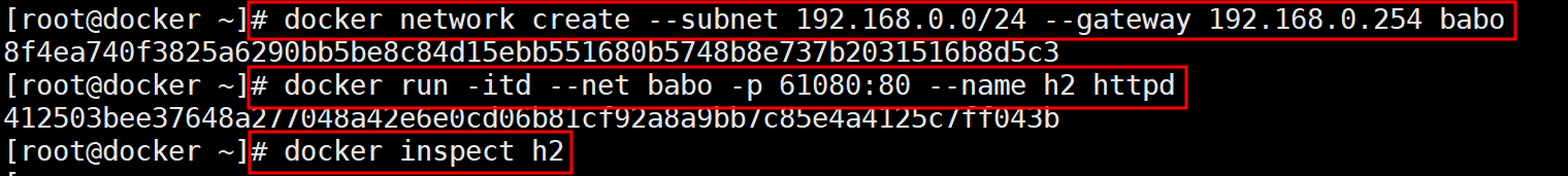 # docker run -itd --net babo -p 61080:80 --name h2 httpd # docker inspect