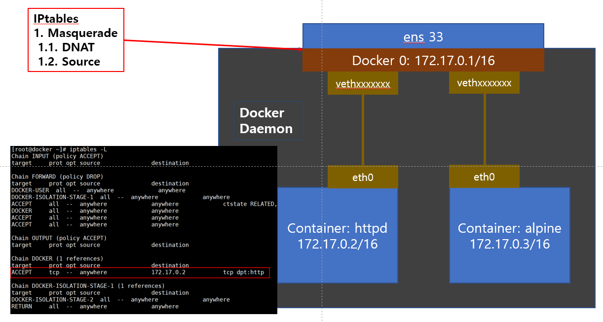 NAT와 Port Fowarding 1.2.1. 위의 그림에서 보시면 httpd 컨테이너를 실행하면 외부의 모든 소스가 내부의 172.17.0.2의 TCP HTTPD로의 통신이 가능하게끔 자동적으로 iptables가 설정 됩니다.