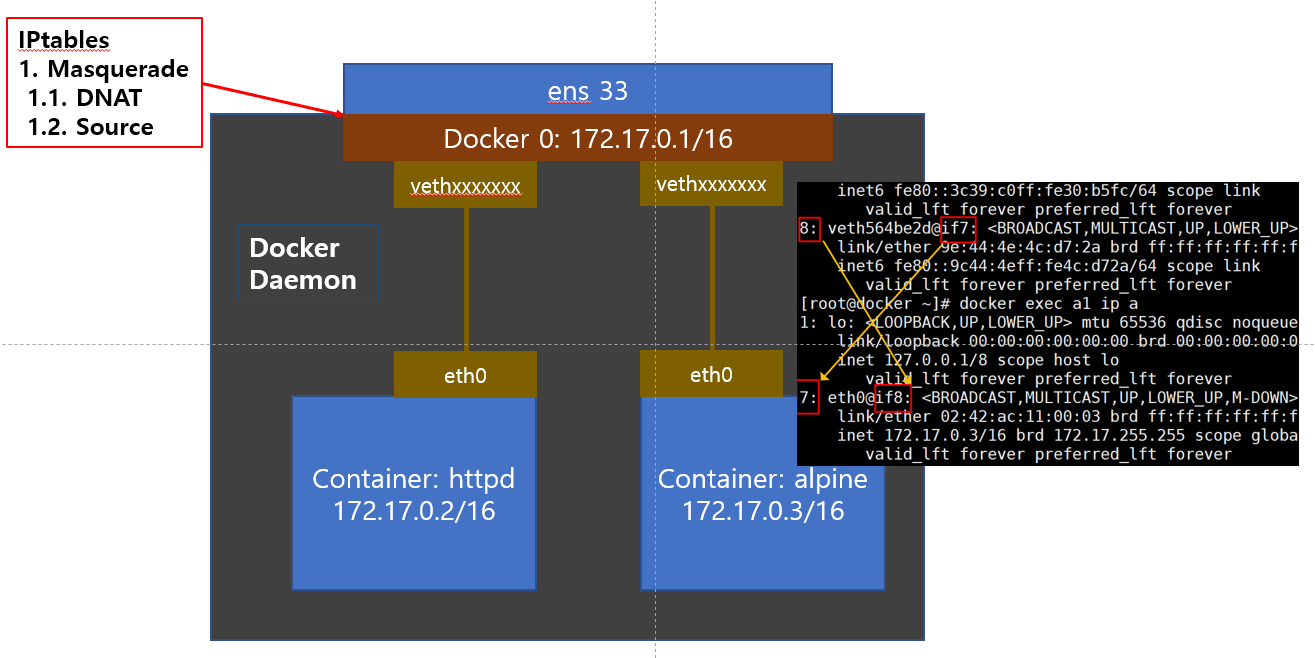 1.2. Bridge에 무슨 NAT냐 하실텐데 iptables의 Masquerade 기능을 이용하여 DNAT과 SNAT을 구현하고 있습니다.