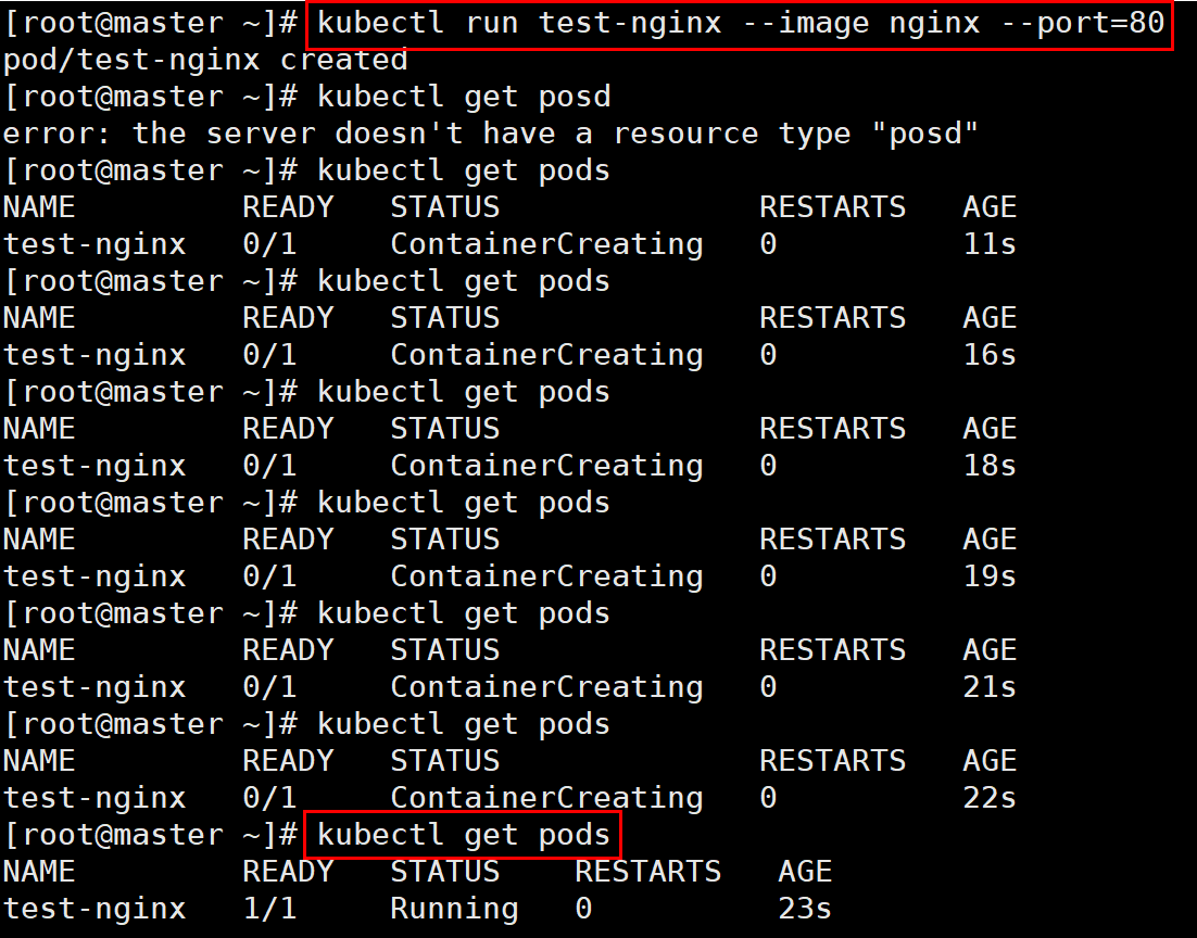 # kubectl run test-nginx --image nginx --port=80 # kubectl get pod