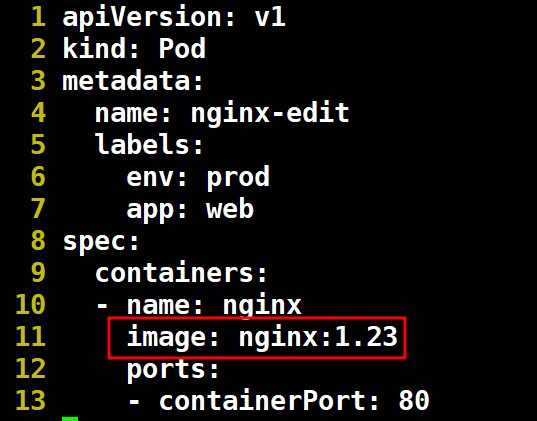 # vi ./pod/nginx.yml apiVersion: v1 kind: Pod metadata: name: nginx-edit lables: env: proc app: web spec: containers: - name: nginx image: nginx:1.23 ports: - containerPort: 80