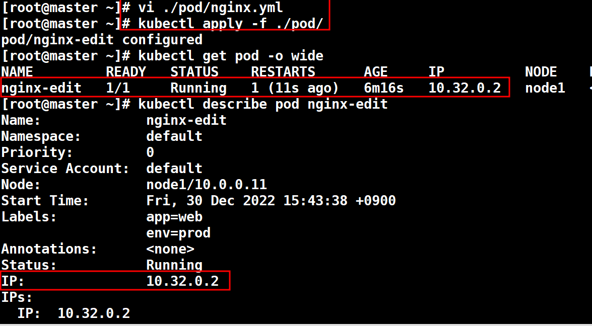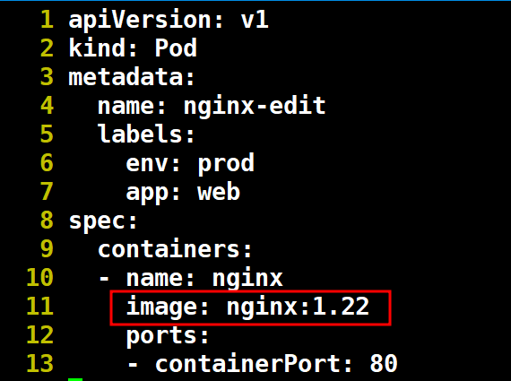 # vi ./pod/nginx.yml apiVersion: v1 kind: Pod metadata: name: nginx-edit lables: env: proc app: web spec: containers: - name: nginx image: nginx:1.22 ports: - containerPort: 80