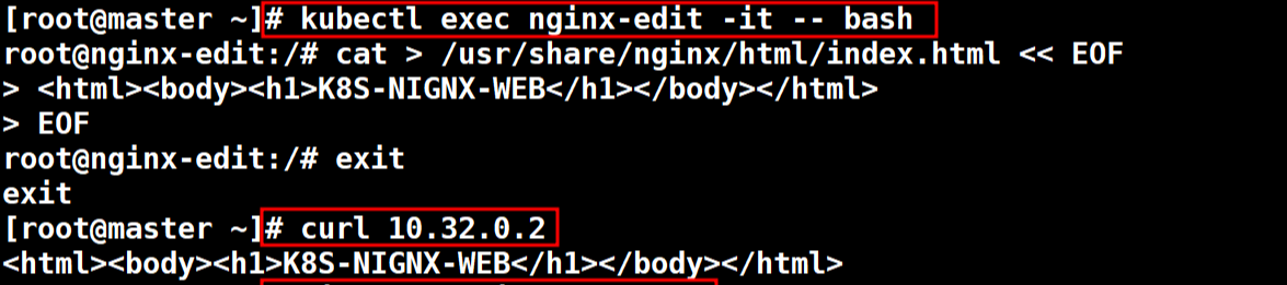 # kubectl exec nginx-edit --it -- bash 아래는 컨테이너 내부에서 작업 nginx-edit) # cat > /usr/share/nginx/html/index.html << EOF <html><body><h1>K8S-NGINX-WEB</h1></body></html> EOF exit # curl 10.32.0.2
