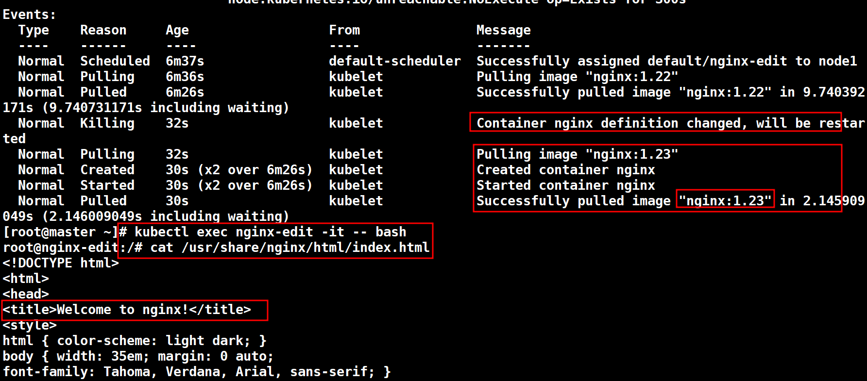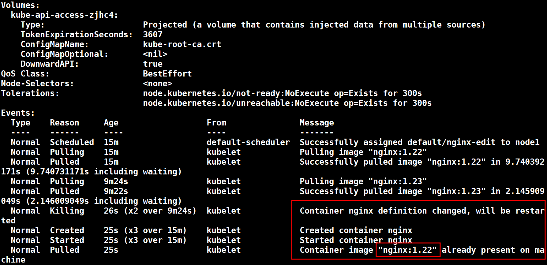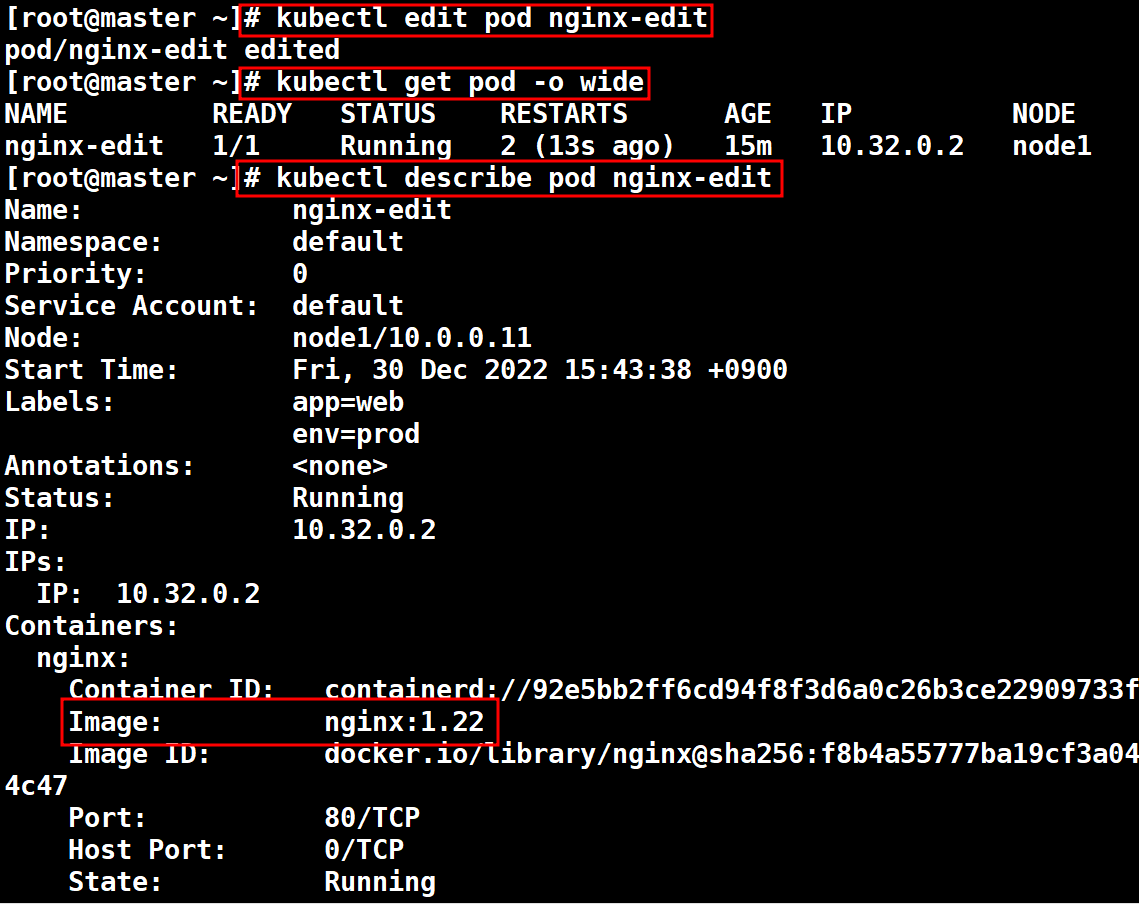 # kubectl edit pod nginx-edit 버젼 부분을 1.23 -> 1.22 로 변경하면 바로 적용됨
