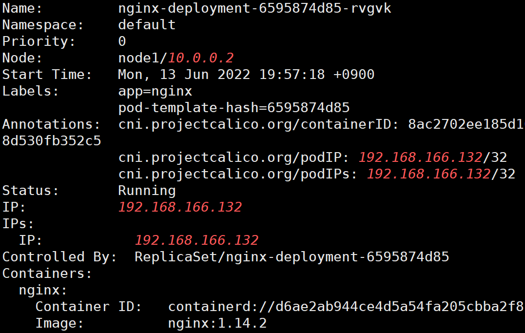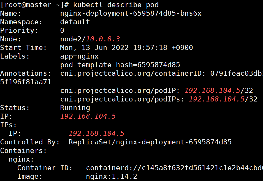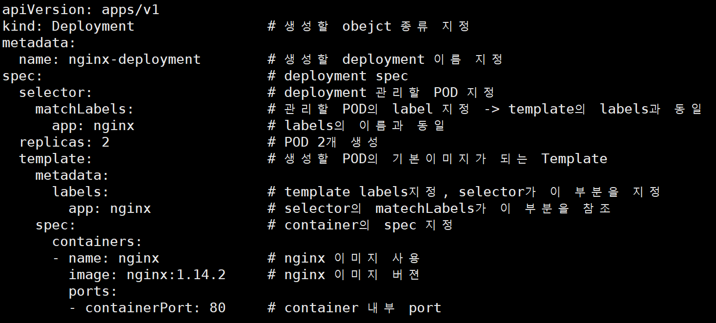 # vi nginxdep.yml apiVersion: apps/v1 kind: Deployment # 생성할 obejct 종류 지정 metadata: name: nginx-deployment # 생성할 deployment 이름 지정 spec: # deployment spec selector: # deployment 관리할 POD 지정 matchLabels: # 관리할 POD의 label 지정 -> template의 labels과 동일 app: nginx # labels의 이름과 동일 replicas: 2 # POD 2개 생성 template: # 생성할 POD의 기본이미지가 되는 Template metadata: labels: # template labels지정, selector가 이 부분을 지정 app: nginx # selector의 matechLabels가 이 부분을 참조 spec: # container의 spec 지정 containers: - name: nginx # nginx 이미지 사용 image: nginx:1.14.2 # nginx 이미지 버젼 ports: - containerPort: 80 # container 내부 port # kubectl apply -f nginxdep.yml2.4.2. deployment 생성 및 확인