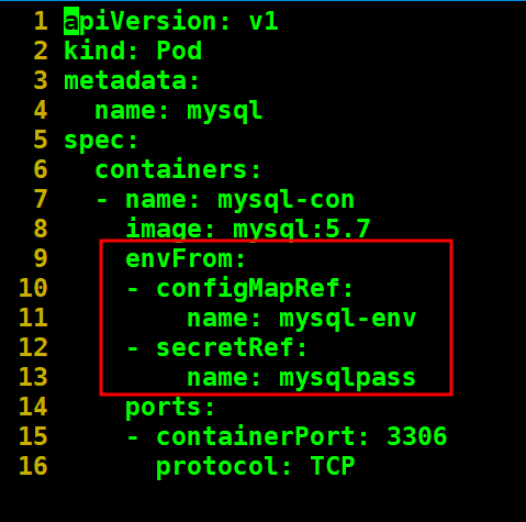 # vi mysql.yml apiVersion: v1 kind: Pod metadata: name: mysql spec: containers: - name: mysql-con image: mysql:5.7 envFrom: - configMapRef: name: mysql-env - secretRef: name: mysqlpass ports: - containerPort: 3306 protocol: TCP